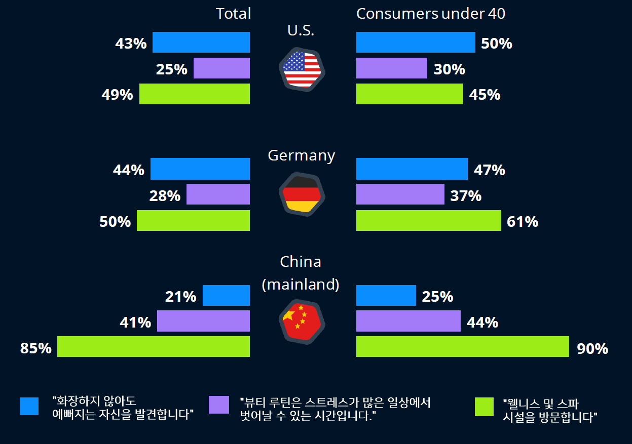뷰티 업계는 구식의 화려함을 버리고 트렌디한 셀프 관리로 변신하고 있습니다. 40세 미만의 소비자들은 셀프 케어의 중요성이 점점 더 커지고 있습니다. 많은 사람들이 최소한의 메이크업을 선택하거나 심지어는 자연스러운 이목구비를 강조하기 위해 메이크업을 하지 않는 것을 선호합니다. 이들은 뷰티 루틴을 일상의 스트레스를 풀기 위한 수단으로 여기며, 셀프 케어 루틴의 일환으로 웰니스 및 스파 시설을 방문할 가능성이 높으며, 이는 전반적인 행복과 웰빙에 기여한다고 믿습니다.