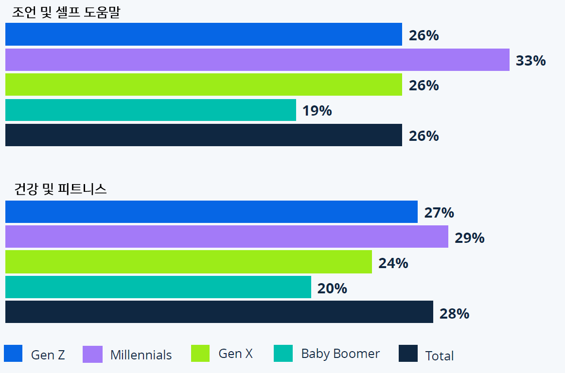 미국의 밀레니얼 세대와 Z세대는 이전 세대보다 더 자주 이러한 크리에이터를 통해 대처 방법을 찾습니다. 현재 밀레니얼 세대의 1/3이 인플루언서로부터 조언과 자조 콘텐츠를 찾고 있습니다.