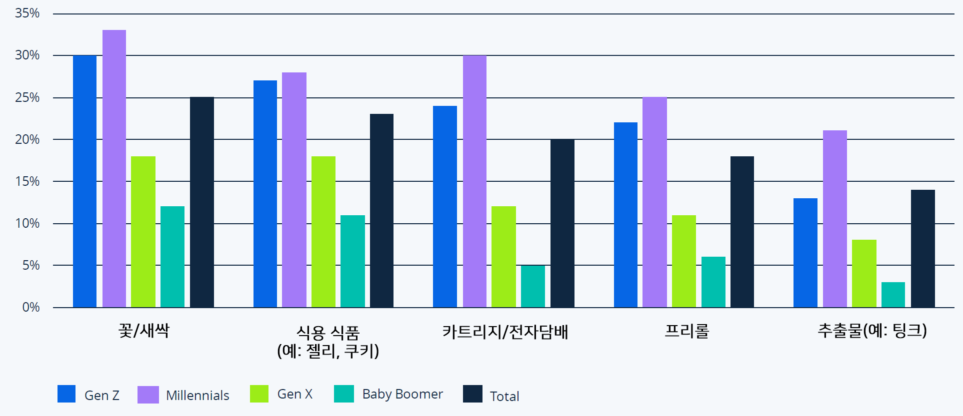이제 지속 가능성은 제품 및 브랜드 포지셔닝을 고려할 때 필수 요소입니다. 소비자의 40% 이상이 지속 가능한 식음료에 추가 비용을 지불할 의향이 있으며, 소비자 3명 중 1명은 지속 가능한 미용 및 퍼스널 케어, 가정용품 및 세탁, 의류 및 신발 품목에 대해서도 동일한 비용을 지불할 의향이 있다고 답했습니다.