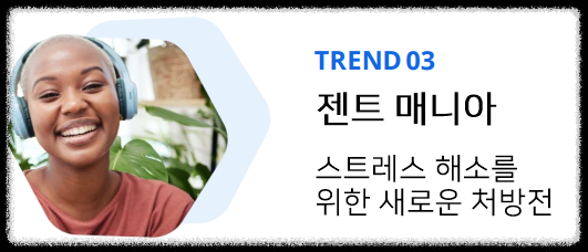 - 젠트 매니아: 스트레스와 불안으로부터 벗어나기 위한 수단이 급증한다. 젠Z와 밀레니얼 세대를 주도하여 이들은 셀프케어와 대체 치료(대마초 등)를 통해 평온함을 찾는다. 브랜드들은 젠투지아스트들을 위한 제품과 서비스를 개발하고, 온라인 건강 전문가들과 협력하여 새로운 고객층을 확보해야 한다.