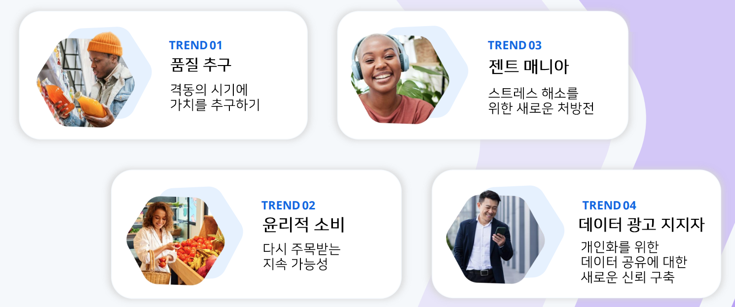 - 윤리적 소비자: 지속가능성과 윤리성이 결정적인 요인이 된다. 소비자들은 친환경 브랜드를 구매하고, 경제적 어려움에도 불구하고 지속가능한 제품에 더 많은 돈을 지불할 의향이 있다. 브랜드들은 지속가능한 브랜딩, 효과적인 메시징, 합리적인 가격을 통해 현대의 사회적으로 의식 있는 소비자들을 확보해야 한다.