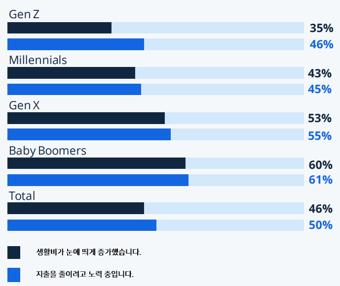 생활비 위기는 세대별로 미국 소비자 지출에 다양한 영향을 미치고 있습니다. 베이비붐 세대는 가장 부유한 세대임에도 불구하고 그 영향을 심각하게 느끼고 있습니다. 베이비붐 세대의 과반수(60%)는 더욱 검소한 소비를 하고 가성비를 우선시하면서 소비 습관에 눈에 띄는 변화가 생겼다고 답했습니다.