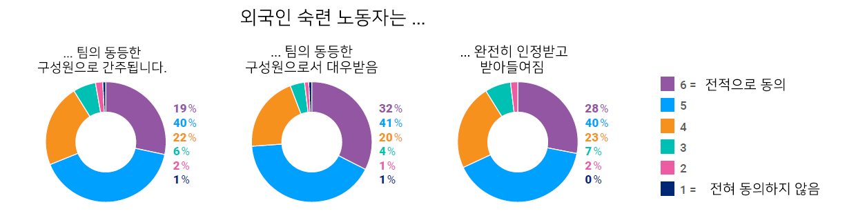 회사에서 외국인 전문가를 받아들이는 것에 대한 질문에 설문조사에 참여한 관리자 10명 중 9명은 외국인 전문가를 팀의 동등한 구성원으로 간주한다는 데 동의했습니다. 10명 중 7명은 이 진술에 높은 수준으로 동의했습니다. 동등한 대우와 수용에 대한 진술에서도 비슷한 양상이 나타났습니다.