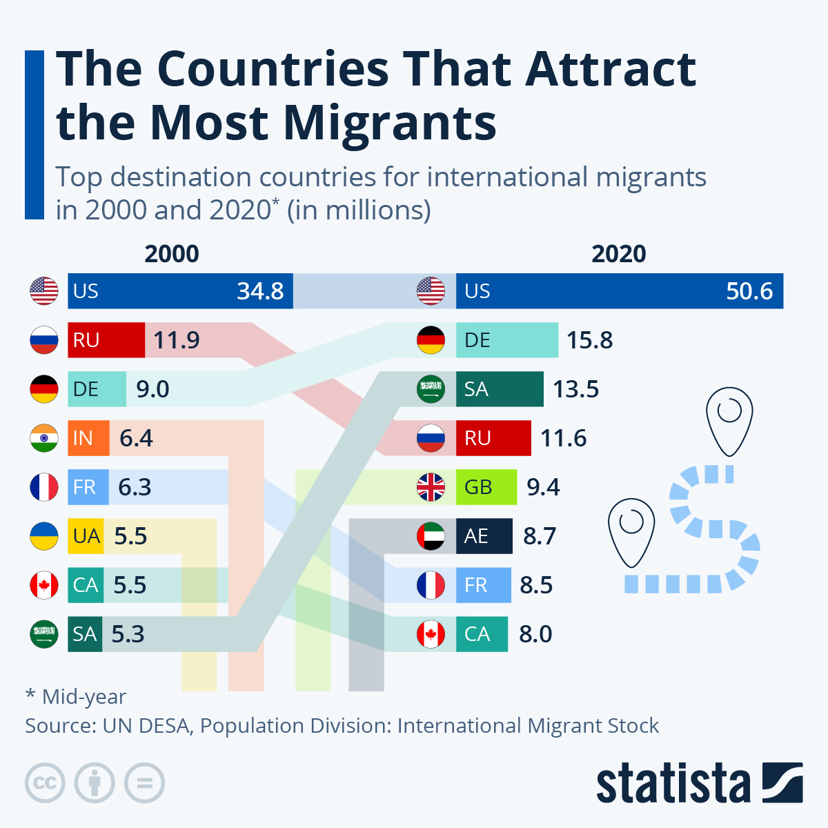 This chart shows the top destination countries for international migrants in 2000 and 2020 (in millions).