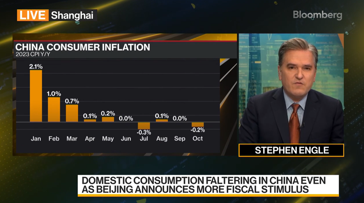 • 중국의 소비 회복이 속도를 늦추고 있다는 데이터가 나왔다. 10월에 소비자가격지수(CPI)가 0.2% 상승했지만, 식품 가격은 0.7% 하락했다. 소비자들은 여전히 저축과 부동산 투자를 선호하고 있다.