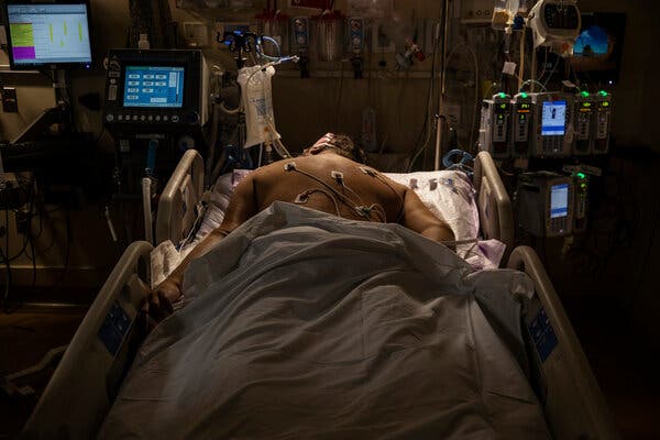 2020년 퀸즈의 중환자실에 있는 코로나19 환자. 2019년과 2021년 사이에 미국의 전체 기대 수명은 약 79세에서 76세로 감소했습니다. 크레딧...뉴욕 타임즈의 빅터 J. 블루
