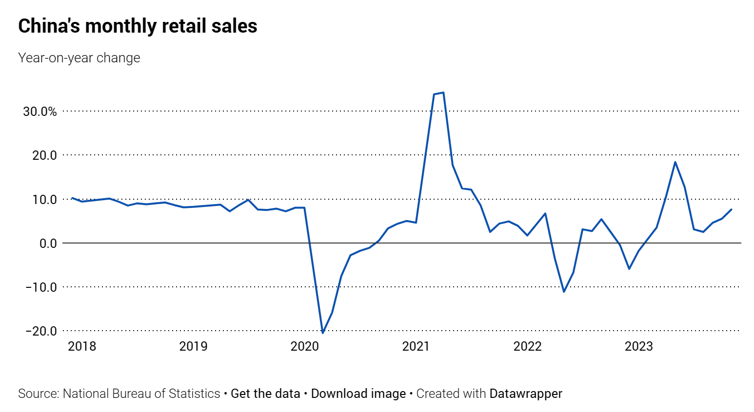 소비 증가: 연장된 ‘황금 주’ 휴가 기간 동안의 소비 붐 덕분에 10월에 소매 판매가 전년 동월 대비 7.6% 증가했습니다. 이는 시장 예상을 능가하며, 9월의 5.5% 증가율에서 상승했습니다.