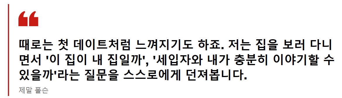 세 집에 살던 시절을 떠올리면 기분이 묘한데, 그게 바로 작년이었다는 사실을 깨닫게 됩니다. 임차인과 소유주 간의 힘의 불균형이 너무 커서 이를 완화하여 집을 살 여력이 없는 사람들에게 더 큰 권리를 부여해야 합니다.