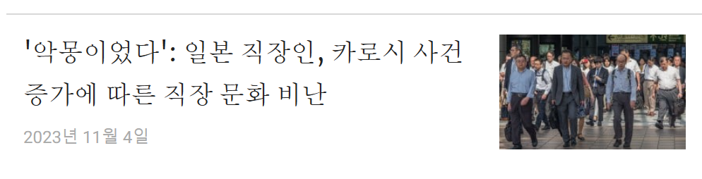 • 과로사와 일본의 사무직 문화: 일본 보건성이 발표한 백서에 따르면, 일본에서는 매년 수천 명이 과로사로 인한 자살을 하고 있으며, 과로사와 장시간 근무와 우울증 사이에도 관련성이 있다고 한다. 일본의 사무직 문화는 변화가 더딘 편이며, 많은 근로자들이 회사에 충성을 다하고 가족을 뒤로 미루는 경우가 많다고 한다.