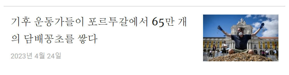 • 담배꽁초 오염에 대한 인식 증진: 기후 활동가들은 65만 개의 담배꽁초를 모아 리스본의 중심부에 쌓아 놓았습니다. 이들은 담배꽁초가 분해되지 않고 유해한 독소를 방출하는 플라스틱 오염의 한 형태라는 것을 사람들에게 알리고자 했습니다.