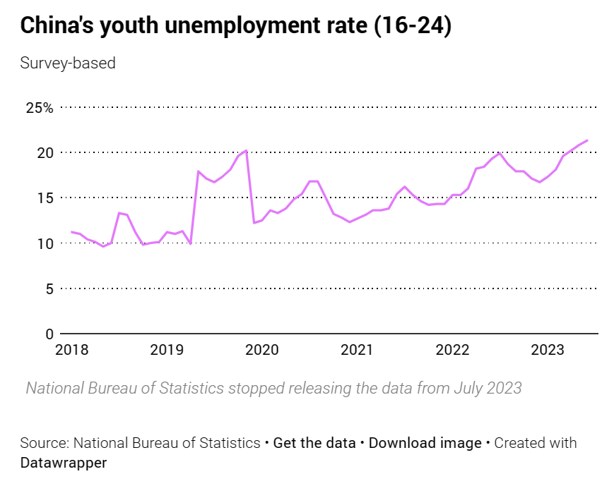 16~24세 연령대의 실업률은 높은 수준을 유지하며 지난 6월 21.3%로 사상 최고치를 기록했지만, 중국은 조사를 더욱 개선하고 최적화할 필요가 있다며 데이터 공개를 중단했습니다.