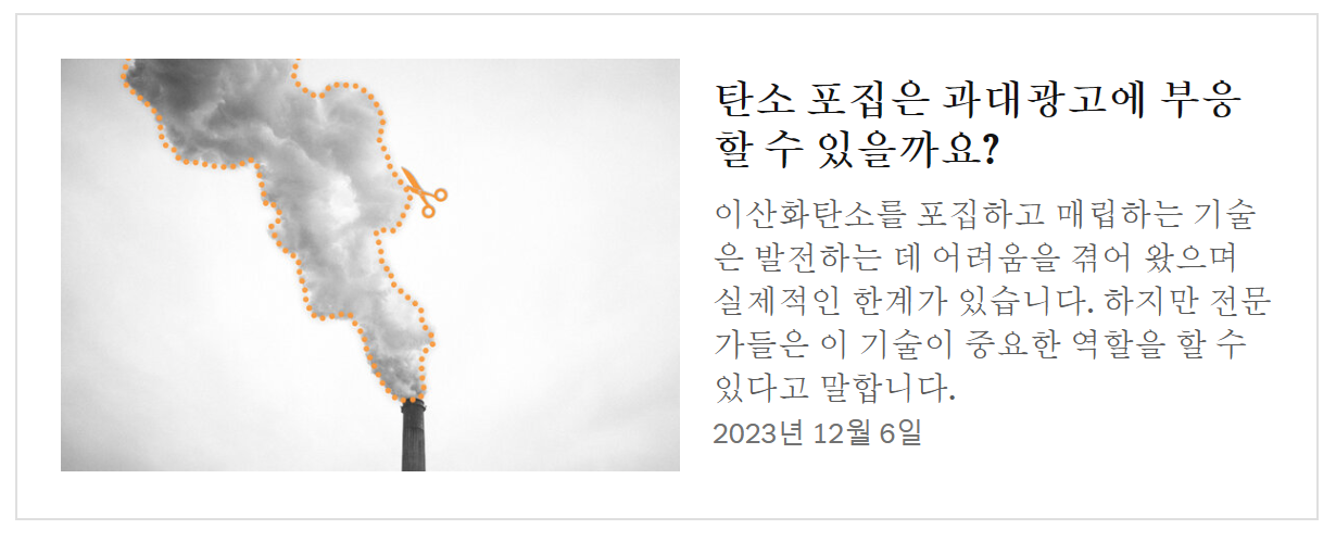 • 이산화탄소 포집과 저장 기술의 현황과 한계: 이 기술은 화석 연료를 사용하는 공장이나 발전소에서 발생하는 이산화탄소를 잡아서 지하에 매몰하는 방법이다. 이 기술은 기후 변화와 싸우는 데 유용한 역할을 할 수 있지만, 아직 비싸고 복잡하며 충분히 증명되지 않았다. 현재 세계에서 이 기술을 사용하는 곳은 매우 적다.
