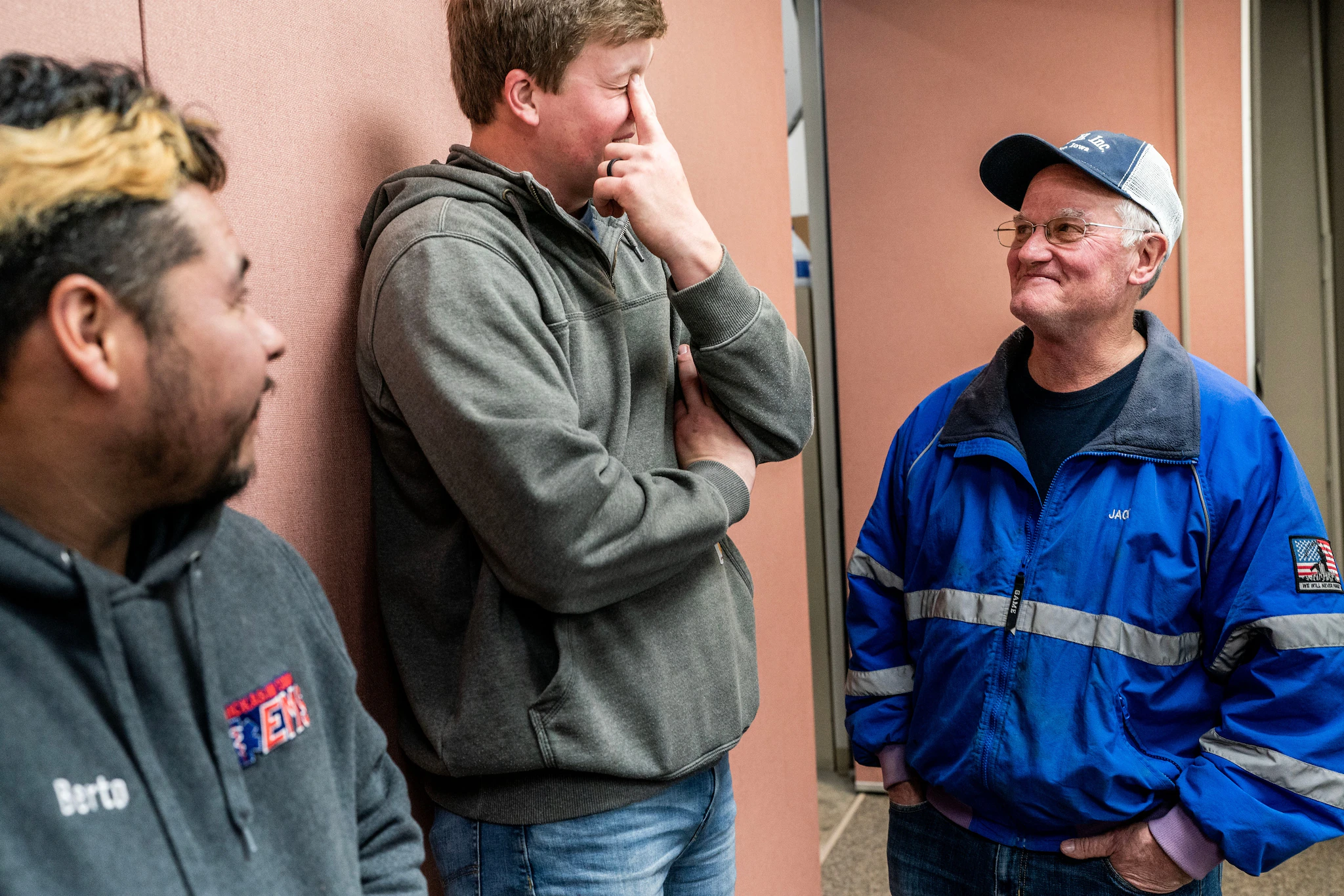 잭(오른쪽)이 지역 소방서에서 동료 소방관들과 이야기를 나누고 있습니다.