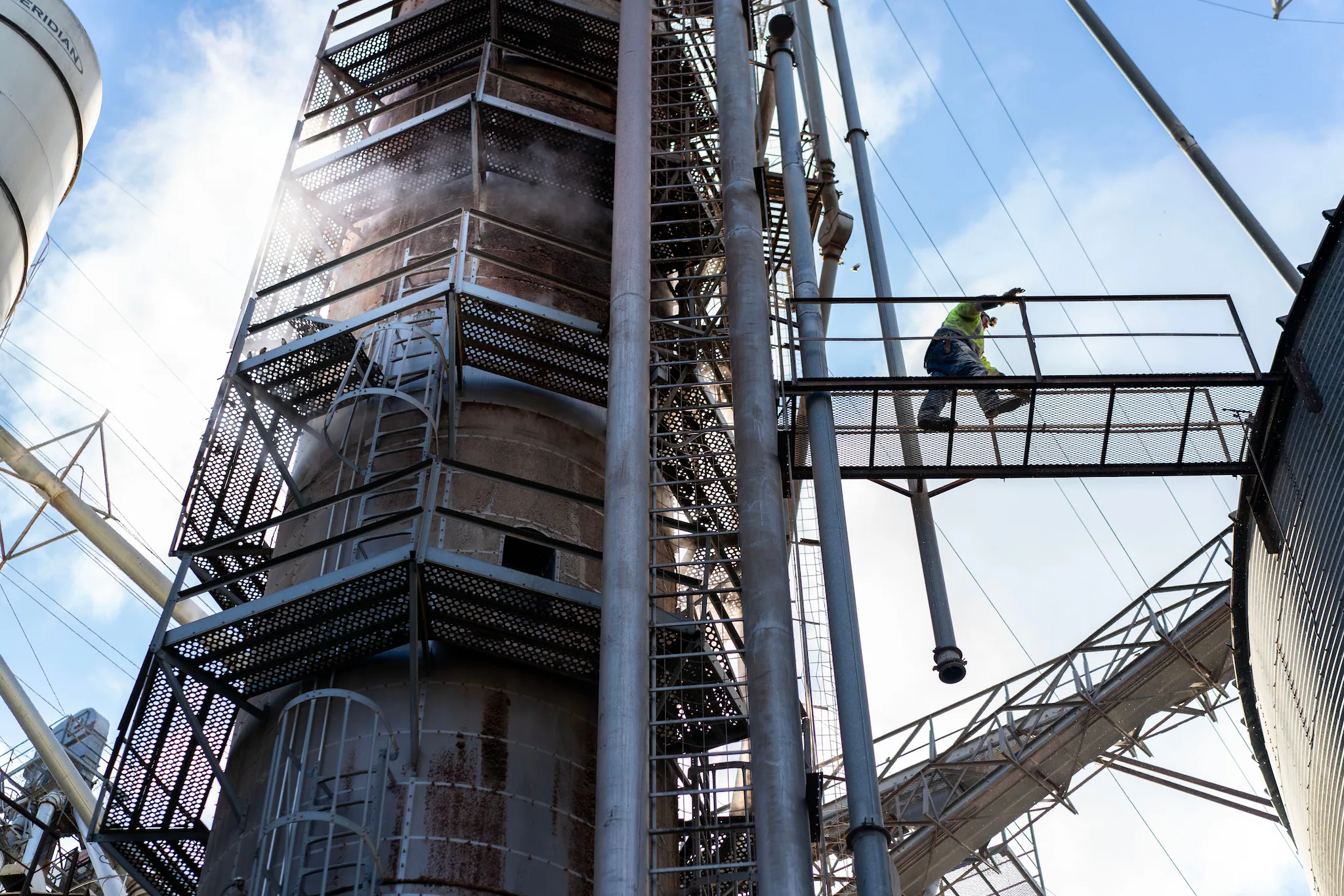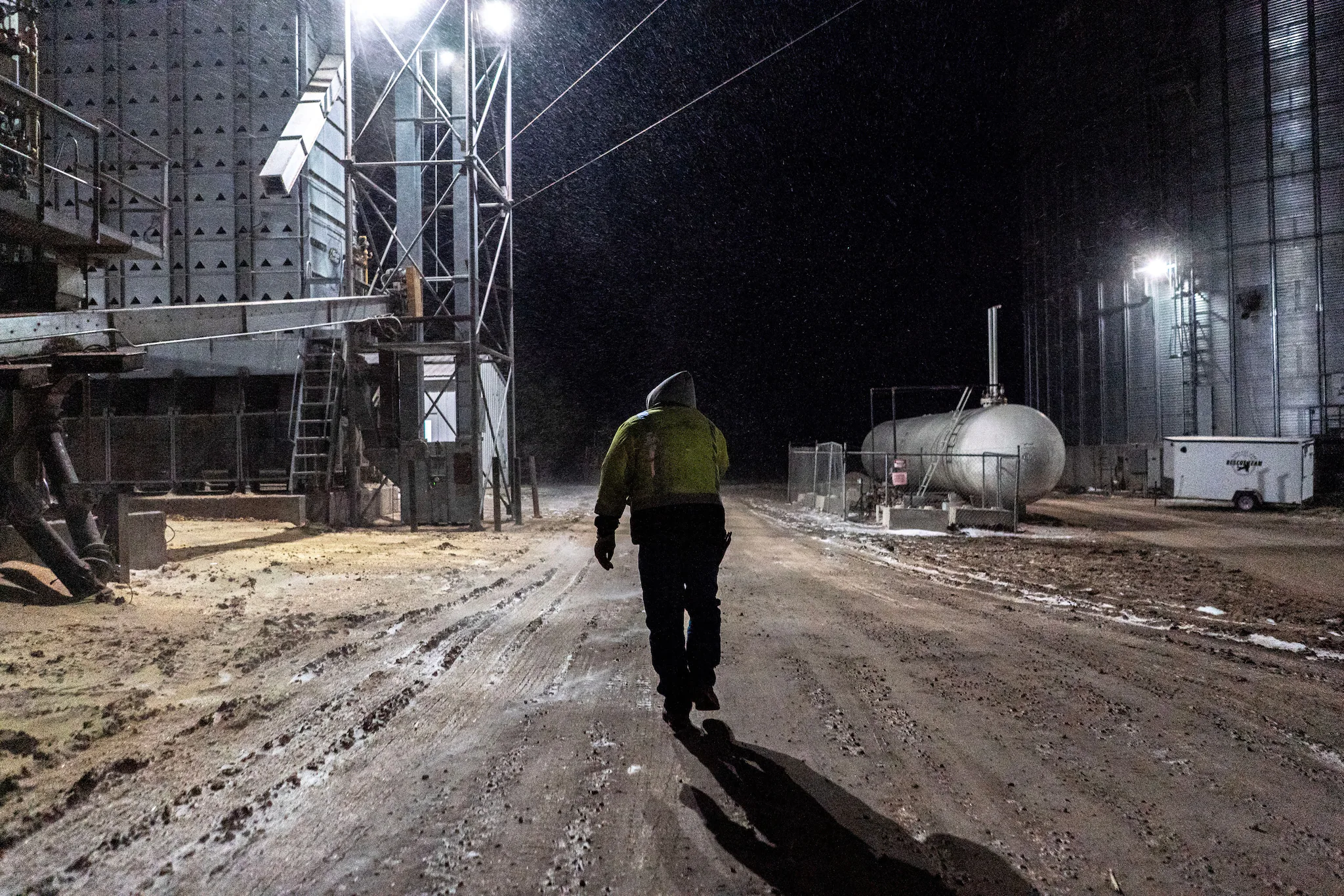 강풍과 영하의 기온 속에서 잭은 사일로 사다리를 타고 사일로와 사일로 사이를 다리 위를 걸어 다니며 옥수수 잔고를 확인합니다.