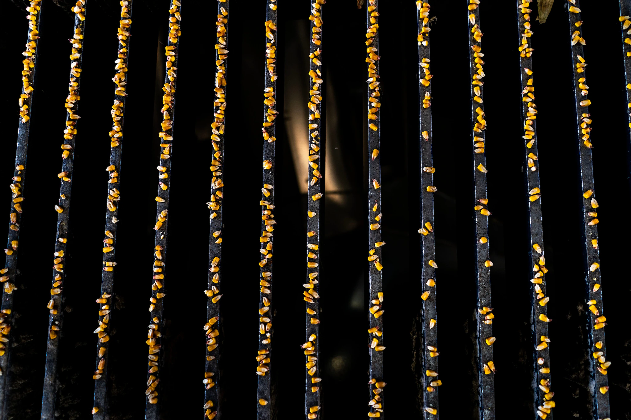 아이오와주 라울러의 한 농장에서 옥수수 알갱이가 제분기에 쏟아진 후에도 화격자 위에 남아 있습니다. (멜리나 마라/워싱턴 포스트)