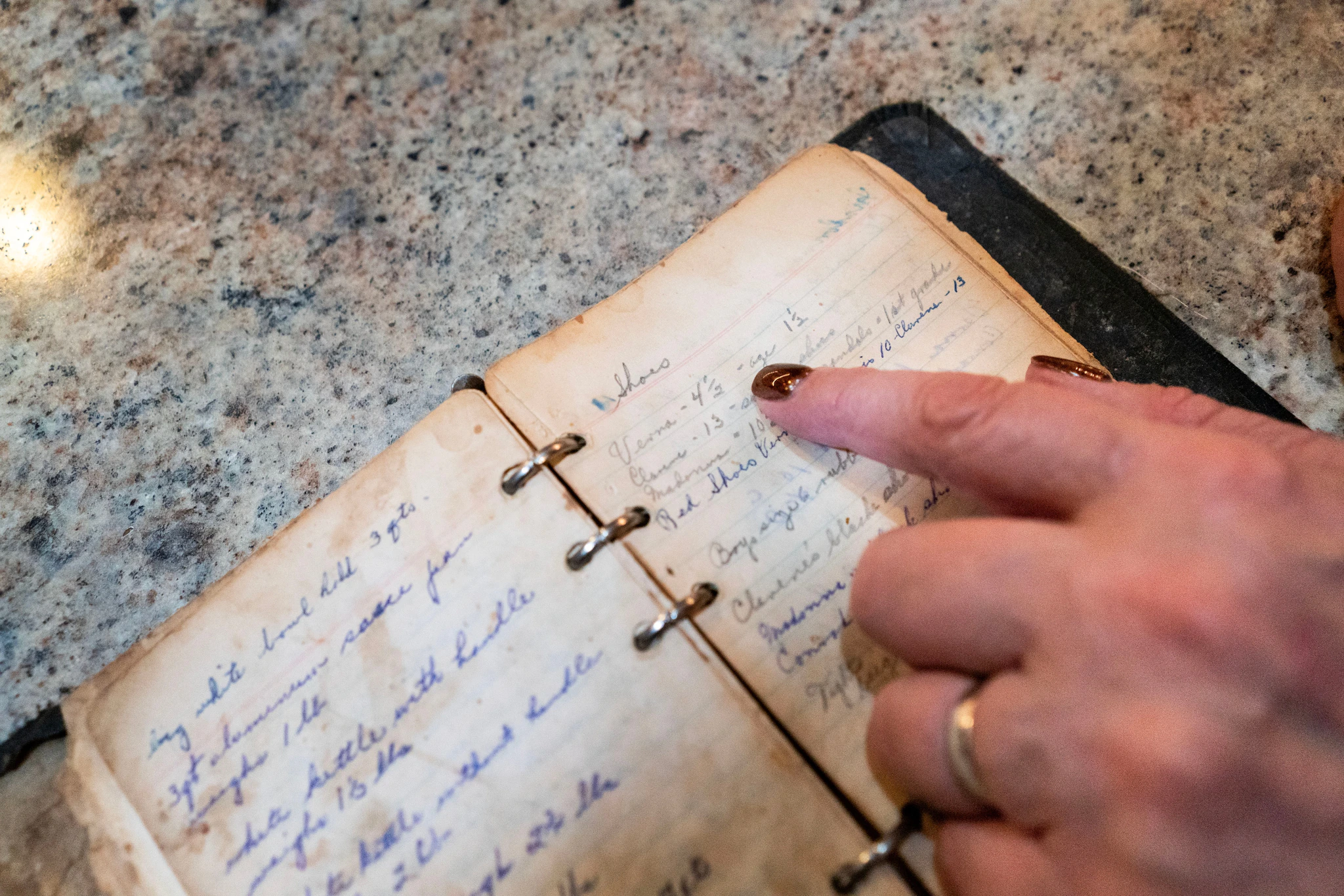 버나는 어머니가 만든 가족 수첩에 적힌 신발 사이즈를 가리킵니다.