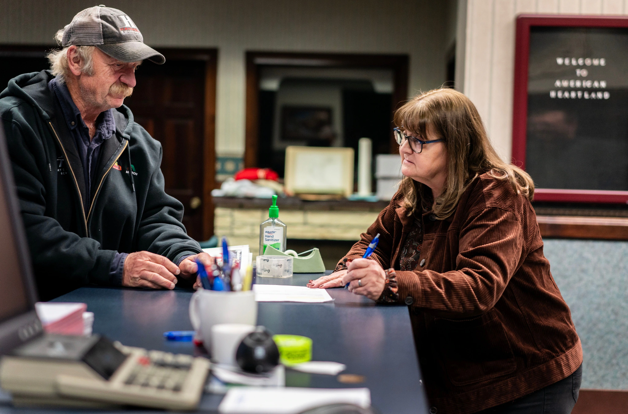 아이오와주 룰러에 있는 버키 편의점에서 식품 쇼핑을 하던 버나가 오랜 친구와 이야기를 나누고 있습니다.