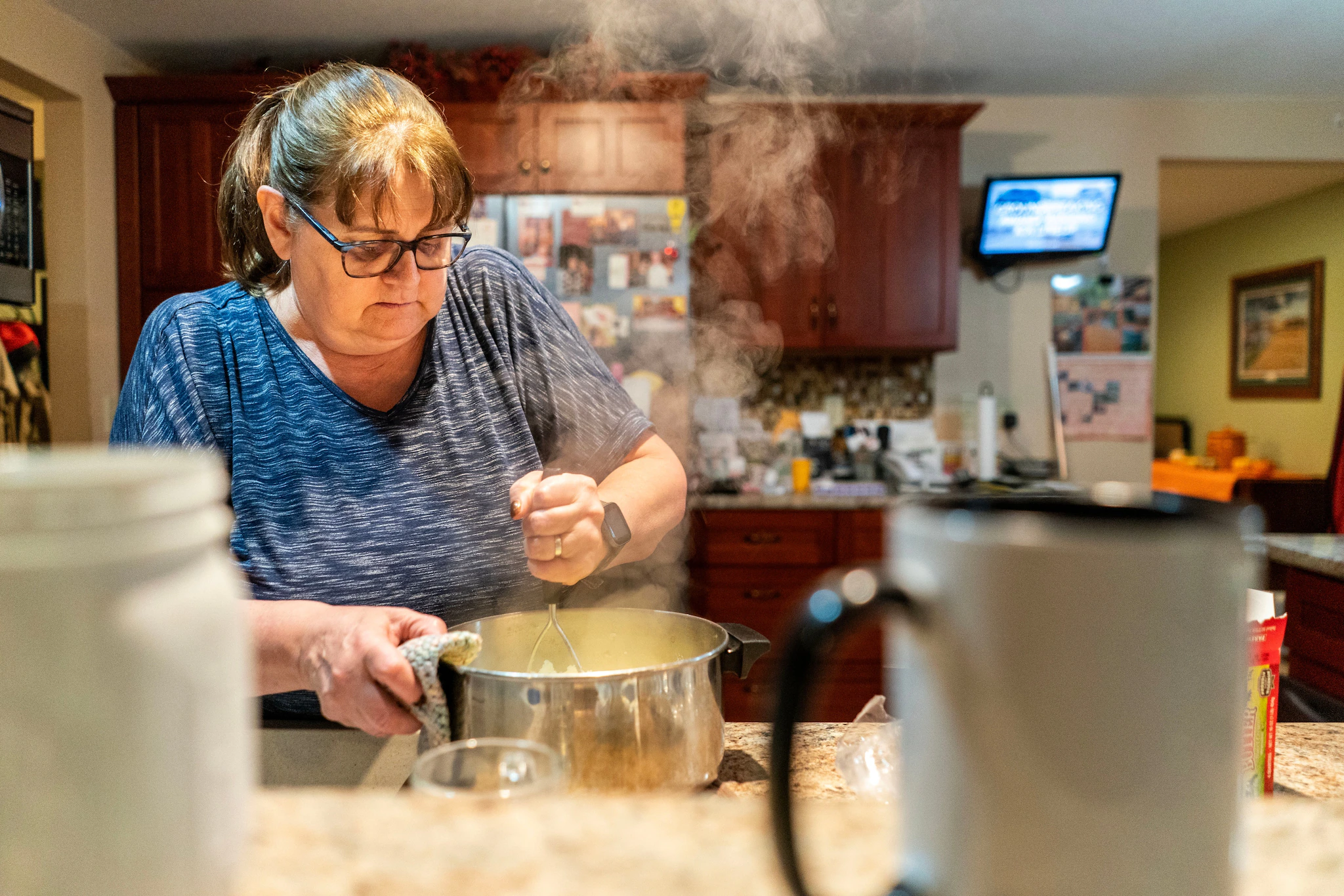 버나는 아이오와주 로러에 있는 자택에서 저녁 뉴스를 보며 남편 잭과 함께 으깬 감자를 만듭니다.