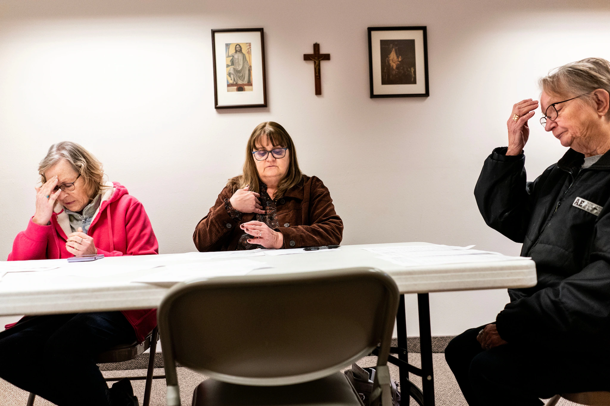 베르나는 아이오와주 라울러에 있는 성모 카멜산 가톨릭 교회에서 기도하는 것으로 교구회 모임을 시작합니다.