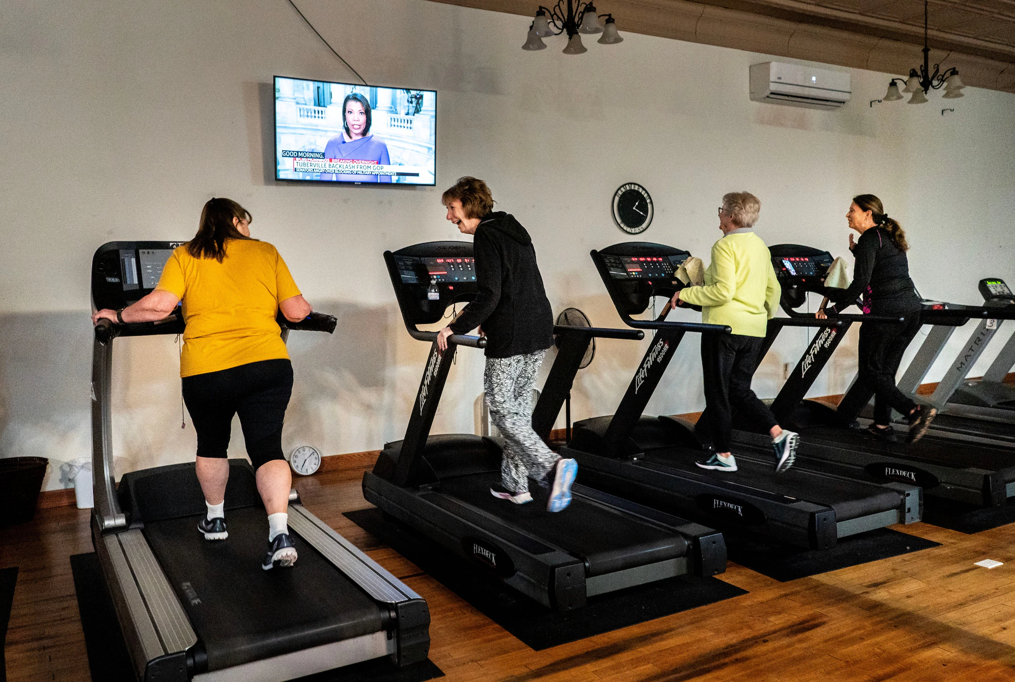 버나는 친구 캐시 팀린, 제인 린치, 린 릭스와 함께 작은 커뮤니티 헬스장에서 운동을 합니다.