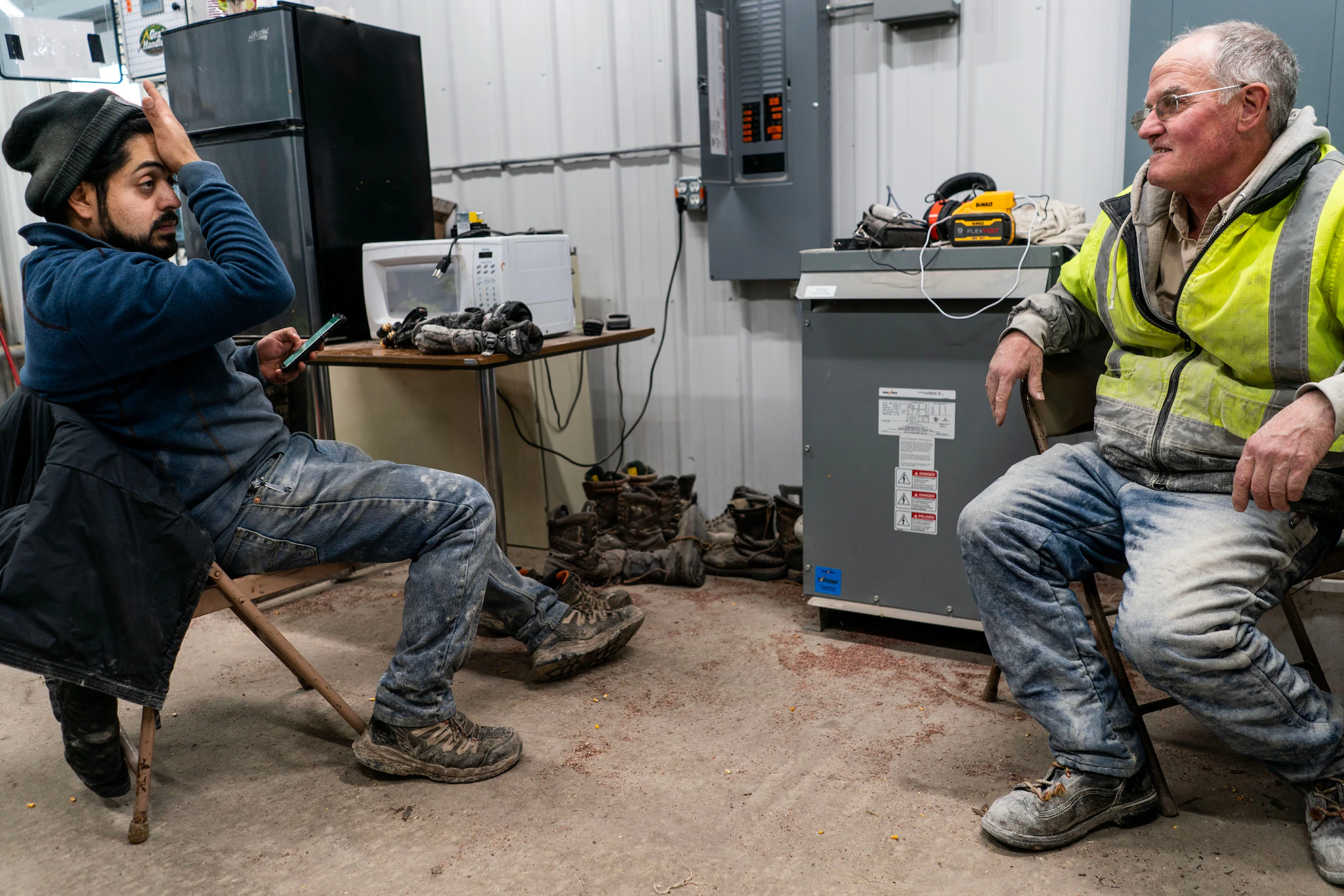 잭과 그의 동료 루이스 트루히요-크루즈는 옥수수 재고를 평가하기 위해 사일로에 올라갈 계획에 대해 이야기합니다.