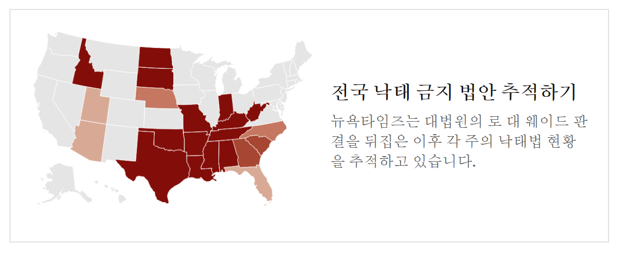 - 낙태 금지 법률: 21개 주에서 Roe v. Wade가 정한 표준보다 더 일찍 임신 기간에 따라 낙태를 금지하거나 완전히 금지하고 있습니다. 일부 주에서는 법원에서 낙태 금지 법률의 효력 여부를 판단하고 있습니다.