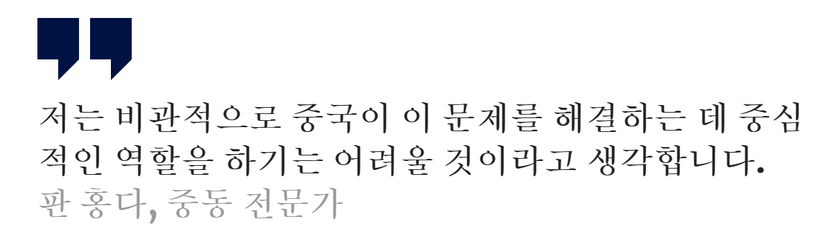 판훙다 상하이국제학원 중동연구소 교수는 현재 중국에 대한 이스라엘의 태도를 고려할 때 "중국이 문제 해결에 중심적인 역할을 하기는 어려울 것으로 비관적으로 본다"고 말했다.