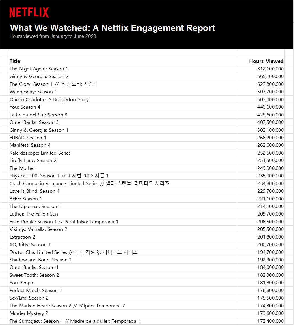 이 페이지는 넷플릭스가 2023년 상반기에 가장 많이 시청된 영화와 TV 프로그램에 대한 시청 데이터를 공개했다는 내용입니다. 요약하면 다음과 같습니다.