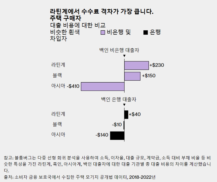 하지만 제3자 수수료를 제거한 후에도 여전히 격차는 존재합니다. 블룸버그에 따르면 비은행 대출자들은 비슷한 가격의 주택을 구입하고 비슷한 이자율을 적용받으며 소득, 부채, 신용도가 비슷한 은행 대출자보다 대출 개시 수수료로 평균 22% 더 많은 비용을 지불했습니다. 비은행 고객 중 라틴계와 흑인 대출자는 백인 주택 구매자에 비해 대출 개시 수수료로 각각 평균 170달러와 120달러를 더 지불했습니다.