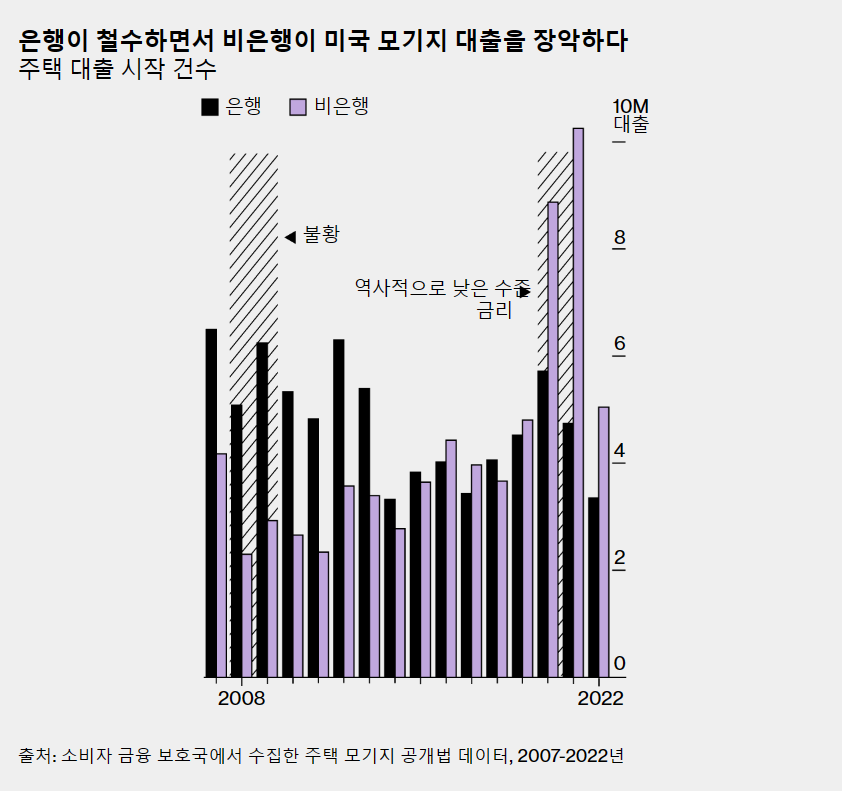 그 빈자리를 수백 개의 비은행 대출 기관이 채웠습니다. 2021년까지 역사적으로 낮은 금리로 인해 모기지 대출이 대침체 이전에는 볼 수 없었던 최고치를 기록하면서, 그 수치는 뒤집혔고 비은행 대출이 미국 전체 주택 대출의 거의 70%를 차지하게 되었습니다. 이 비율은 작년에 60%로 떨어졌고, 모기지 금리 상승으로 대출 수요가 줄어들면서 비즈니스에 어려움을 겪었습니다.
