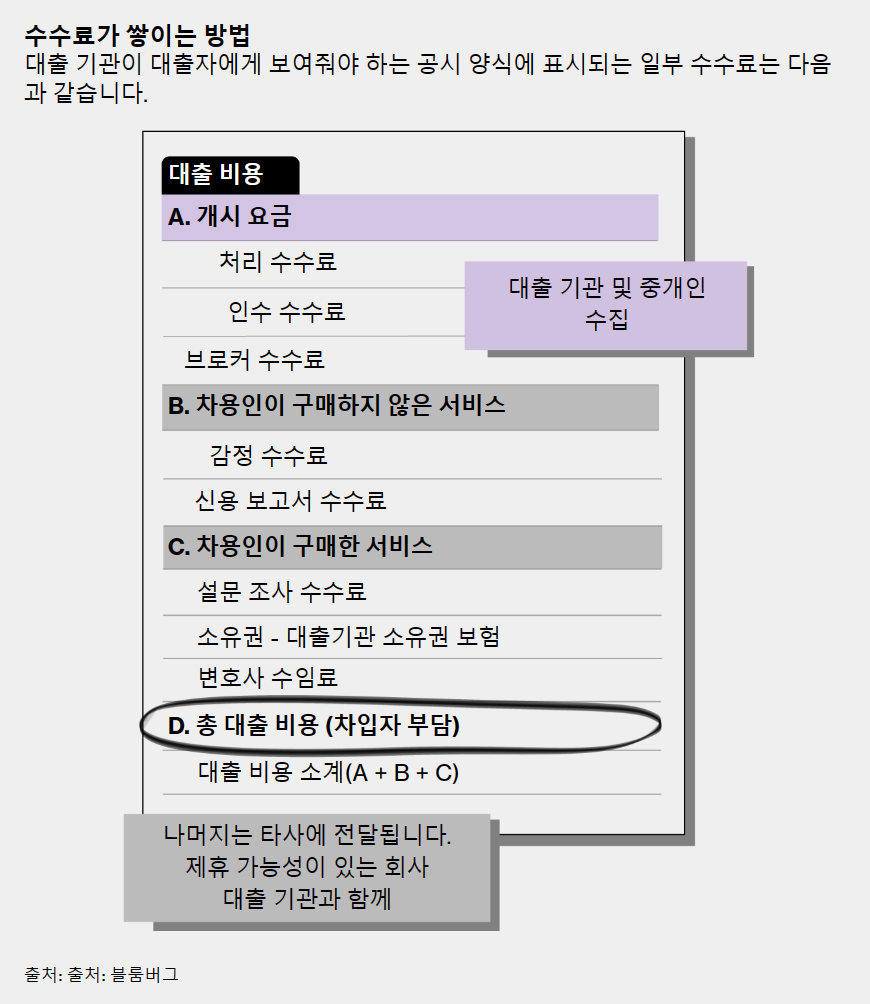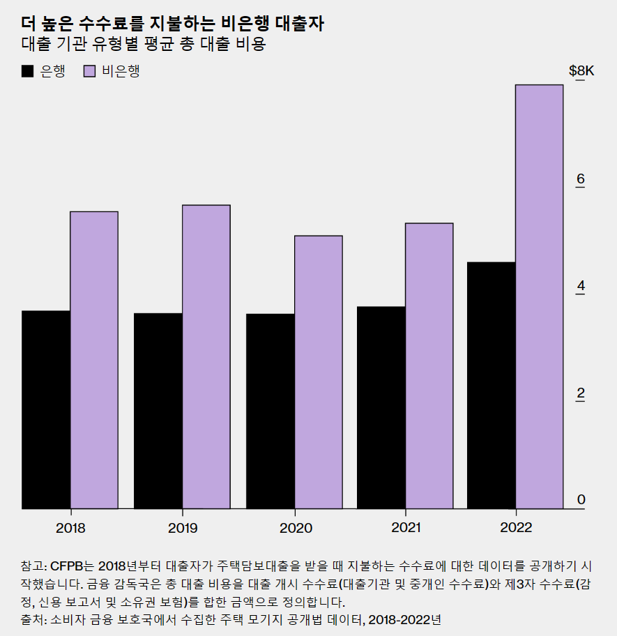 블룸버그가 조사한 수수료는 대출자가 대출을 받기 위해 지불해야 하는 초기 선불 비용으로 구성됩니다. 여기에는 대출 기관과 중개인이 징수하는 개시 수수료와 보험사, 감정인, 변호사 등 외부 기관에 지불하는 수수료가 모두 포함됩니다. 분석 결과, 은행과 비은행 간 대출 개시 수수료의 격차가 제3자 수수료의 격차보다 더 큰 것으로 나타났습니다.