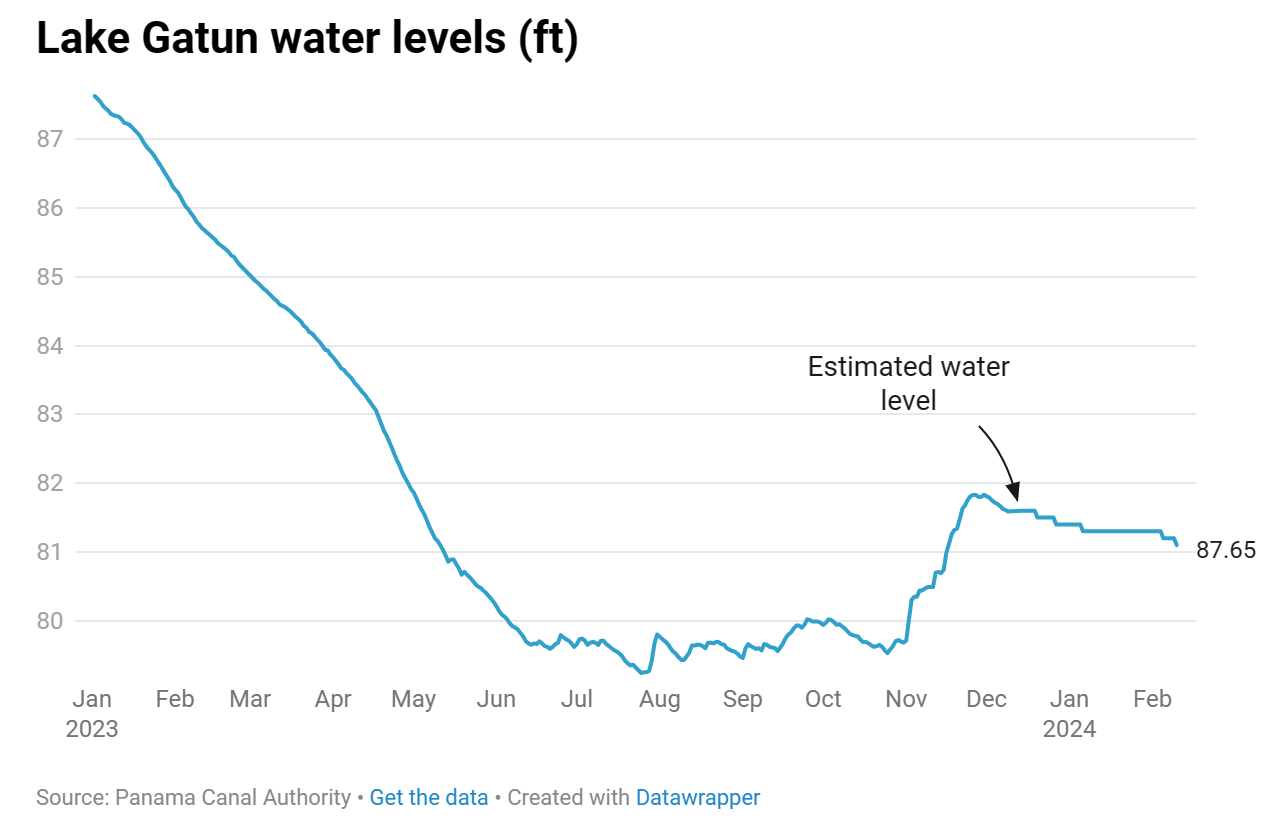 운하의 수문은 파나마 인구 430만 명 중 절반 이상이 거주하는 가툰 호수의 담수에 의존하고 있습니다. 엘니뇨 현상으로 인해 물 부족 현상이 악화되면서 하루에 30억 리터의 물이 부족해졌습니다. 운하 당국은 2월까지 통과 선박 수를 18척으로 줄여 운송에 심각한 영향을 미쳤습니다. 트레이더들은 한 번에 몇 주씩 기다리거나, 대기열에서 앞서 나가기 위해 최대 4백만 달러를 지불하거나, 아예 이 항로를 피하는 등 선택의 여지가 없습니다.