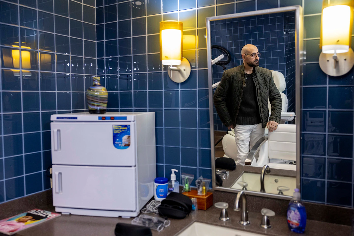 아슈라프 유세프가 12월 21일 버지니아주 맥린에 있는 애쉬 살롱 앤 스파의 사용하지 않는 트리트먼트 룸에 서 있습니다. 살롱을 소유하고있는 Ashraf는 전염병 이후 수익이 회복되지 않았으며 스파 서비스를 중단해야한다고 말했습니다. (아만다 안드라데-로즈 / 워싱턴 포스트 제공)
