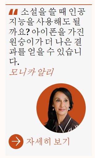 • 인공지능과 작가들의 충돌: 이 페이지는 소설가 Monica Ali가 인공지능(AI)이 창작에 미치는 영향에 대해 쓴 글을 발췌한 것이다. 그녀는 OpenAI와 Meta가 저작권자의 동의 없이 작품을 사용해 언어 모델을 훈련시키는 것에 대한 저자들의 소송을 소개한다.