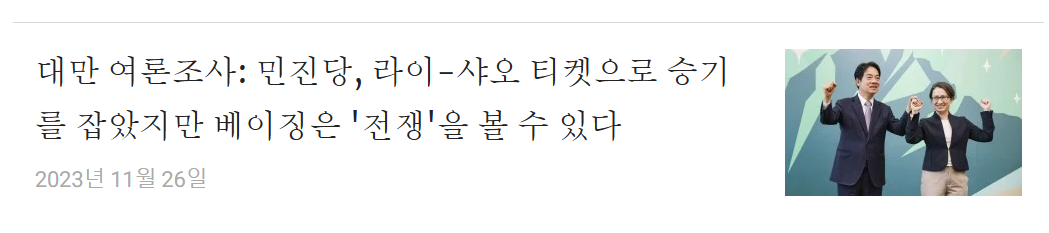 - 대만 선거 2024: DPP는 ‘완벽한 조합’ 라이-효 티켓에서 승리를 감지하지만 베이징에게는 ‘전쟁을 의미할 수 있다’. 이 티켓은 대만의 대통령 후보인 라이 청더와 미국에 대한 사실상의 대사인 효 비금이 함께 출마한 것으로, 독립 지향적인 민주진보당(DPP)이 집권을 유지할 수 있는 신호라고 분석가들은 말한다. 그러나 승리는 베이징이 이들을 "독립주의자들의 연합"으로 보고 있으며, 대만에게는 "전쟁을 의미할 수 있다"고 그들은 말한다.