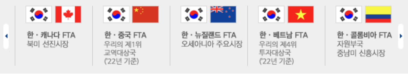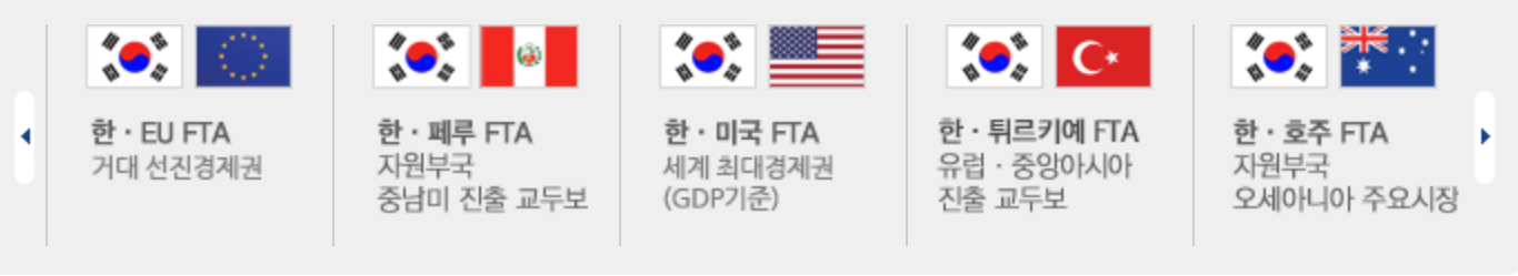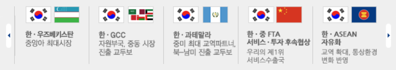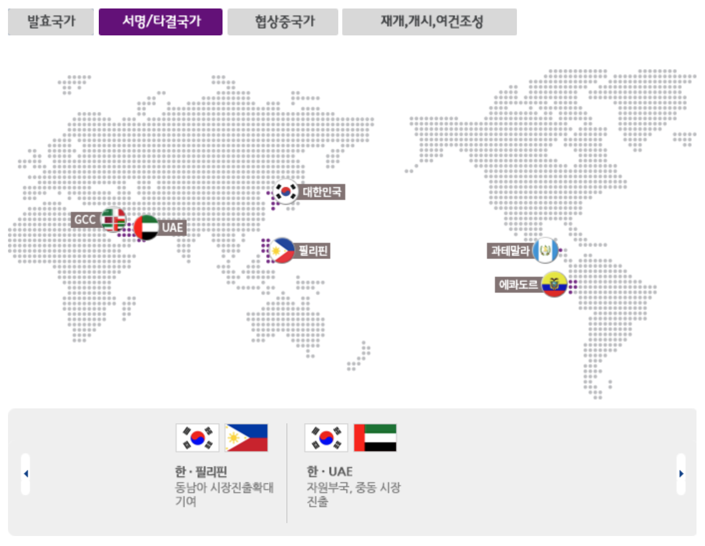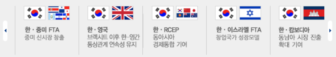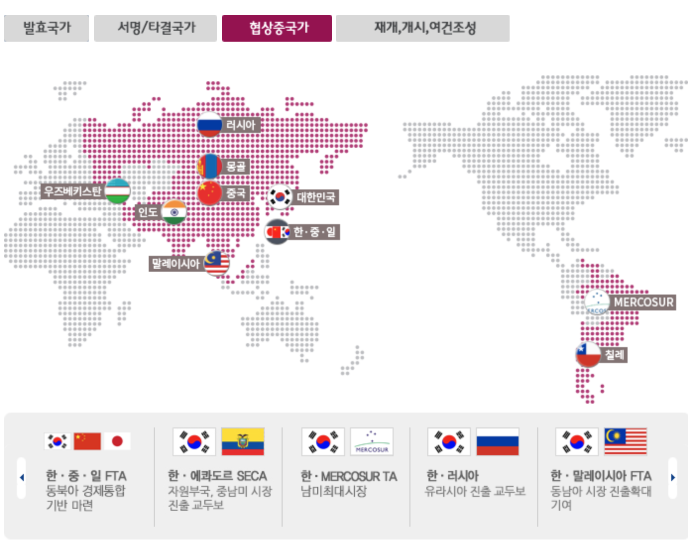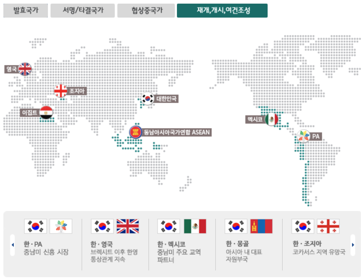 현재 한국은 전자상거래 챕터를 포함한 FTA를 EU, 미국, 중국, 베트남, 콜롬비아, 중미5개국, 영국, RCEP, 이스라엘, 캄보디아, 인도네시아, 필리핀, UAE, 에콰도르 등 59개국 21건과 체결하였으며, GCC, 우즈베키스탄, 과테말라, MERCOSUR, 러시아, 한중일, 말레이시아, 한-아세안 추가 자유화 등 8개국 8건과 협상을 진행하고 있습니다.