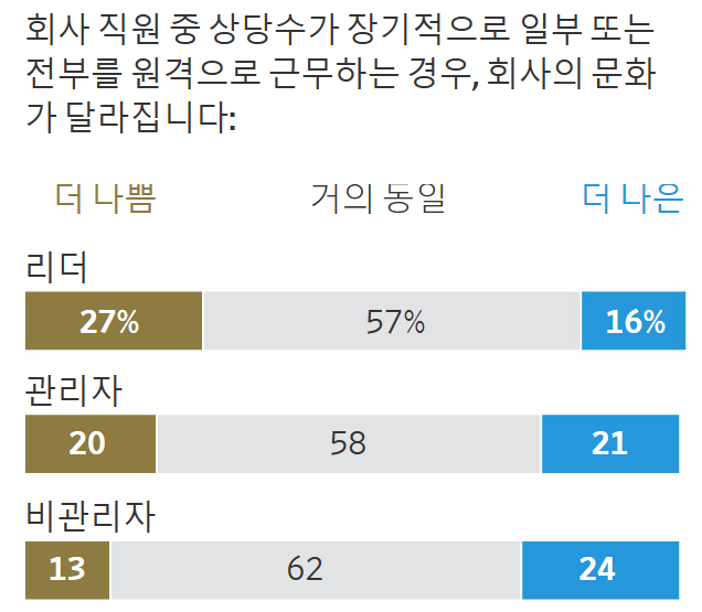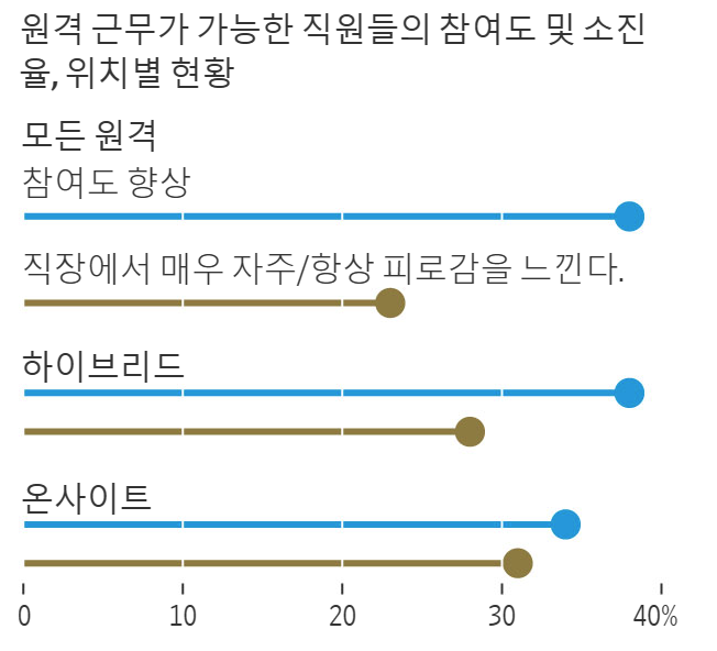 갤럽의 직장 관리 관행 연구 책임자인 벤 위거트는 원격 근무자의 전반적인 행복지수가 더 높은 것으로 나타났다고 말합니다. 갤럽의 데이터에 따르면 원격 근무자의 23%는 직장에서 매우 자주 또는 항상 소진감을 느낀다고 답한 반면, 하이브리드 근무자의 28%와 완전 현장 근무자의 31%는 소진감을 느끼지 않는다고 답했습니다.