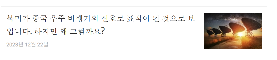 - 중국의 비밀 우주 비행기: 중국은 2023년 12월 15일 목요일에 재사용 가능한 실험 우주 비행기를 성공적으로 발사했습니다. 이 비행기는 2020년과 2022년에 이어 세 번째로 발사되었으며, 기술적 세부사항이나 이미지는 공개되지 않았습니다.