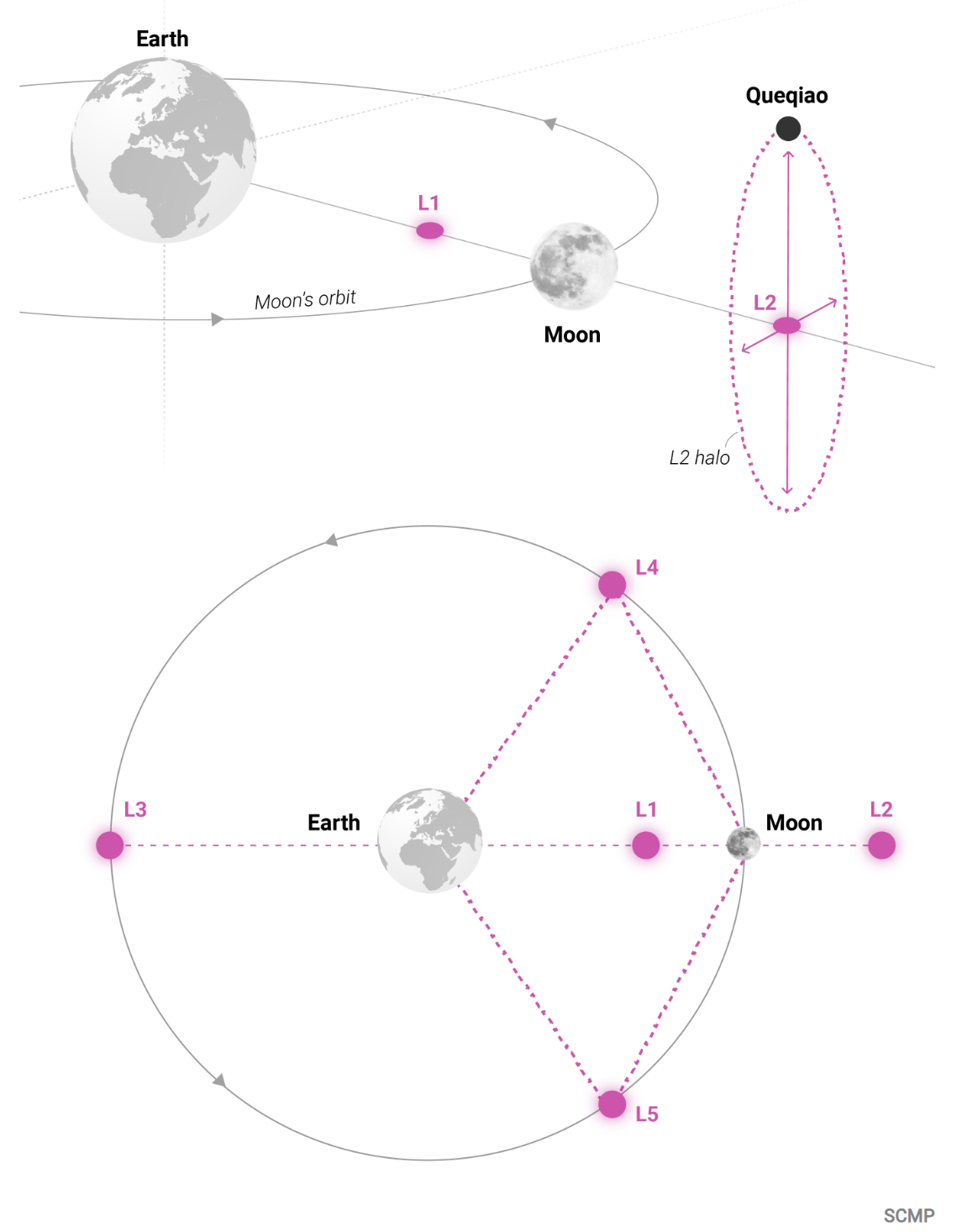 중국은 2018년에 지구-달 시스템의 L2 지점에 퀘차오 중계 위성을 배치하여 달의 먼 쪽에 최초로 도달한 창어 4호 달 탐사선과 통신을 했습니다.