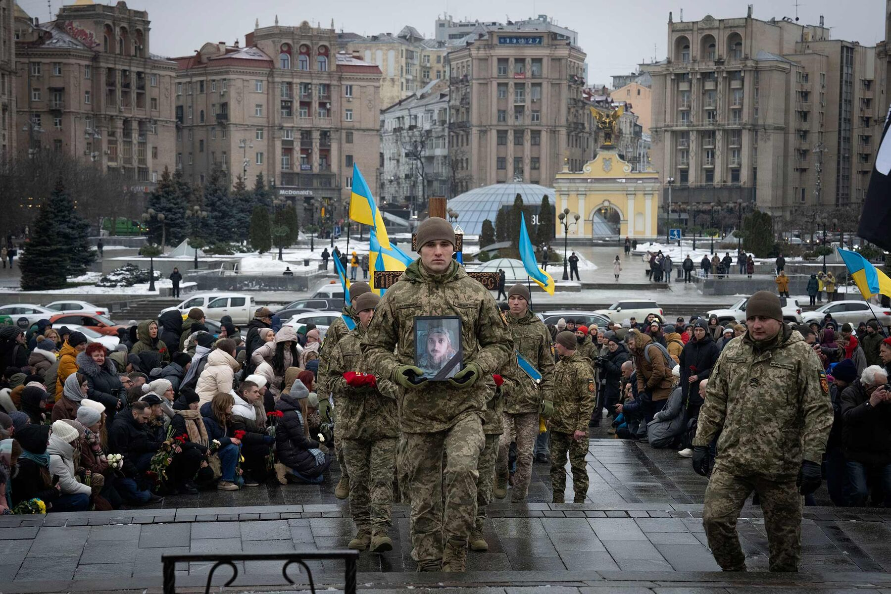 2024년 1월 11일 키예프에서 열린 장례식에서 군인들이 우크라이나 군인이자 시인 막심 크리프초프의 관을 옮기는 동안 사람들이 무릎을 꿇고 있다.2024년 1월 11일 키 예프. 사진작가: 에프렘 루카츠키/AP