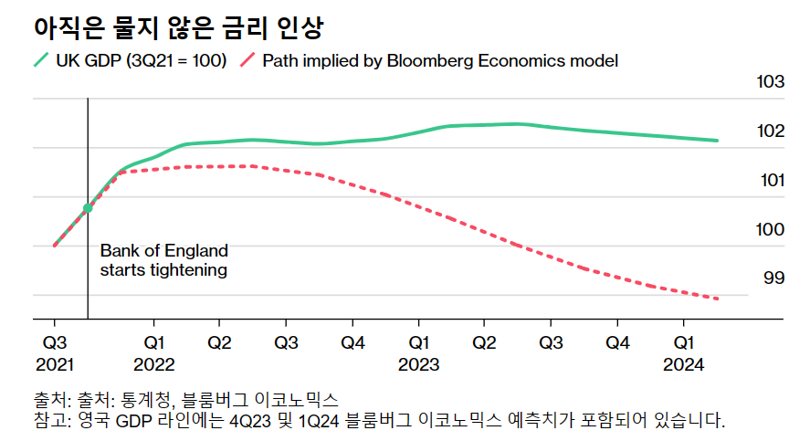블룸버그 이코노믹스의 모델에 따르면 유로 지역 국내총생산은 2.5%의 타격을 받을 것으로 예상됩니다. 영국의 경우 이에 상응하는 수치는 4.7%입니다. 지금까지의 데이터는 두 나라의 경제가 둔화되었지만 경기 위축은 아니라는 다른 결과를 보여주고 있습니다.