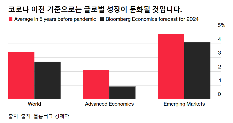 블룸버그 이코노믹스의 2024년 글로벌 성장률 베이스 케이스는 2.7%로, 팬데믹 이전인 3.4%보다 낮고 2001년 이후 비위기 연도 중 가장 낮은 수치로 경제가 흔들리고 있음을 나타냅니다.