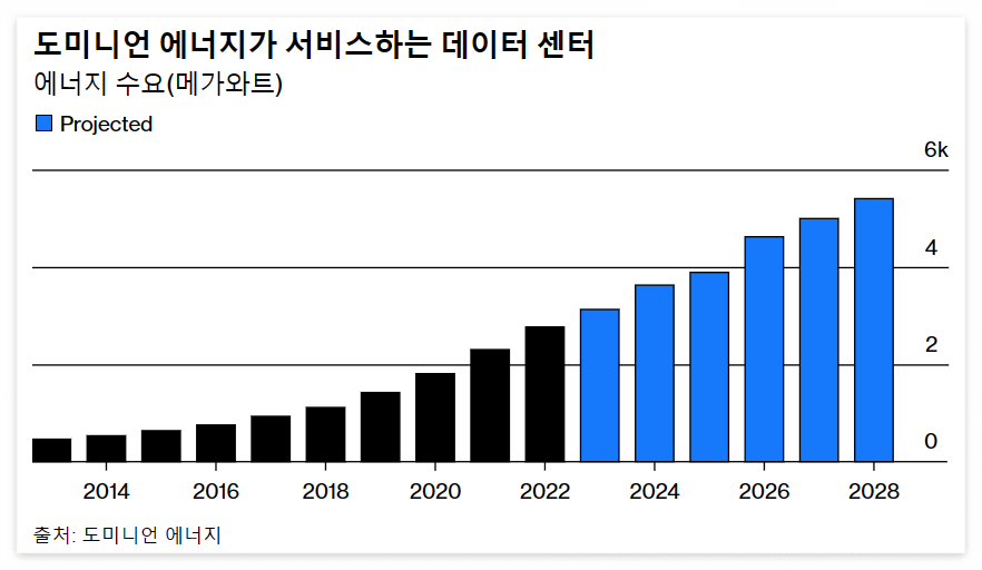 세계 최대의 데이터 센터 허브인 버지니아는 팬데믹으로 인해 전력 수요가 급증했습니다. 는 2022년 3개월 동안 신규 데이터 센터 연결을 중단해야 했지만, 이후 루던 카운티 동부에 있는 27개의 신규 데이터 센터를 연결했습니다. 이 회사는 향후 15년 동안 서비스 지역의 수요가 매년 5% 가까이 증가하여 총 전력 생산 및 판매량의 거의 두 배에 달할 것으로 예상하고 있습니다. 이에 대비하기 위해 Dominion은 미국 최대 규모의 해상 풍력 발전소를 건설하고, 태양 에너지와 배터리 스토리지를 추가하고, 새로운 가스 발전에 대한 투자를 제안하고 있습니다.