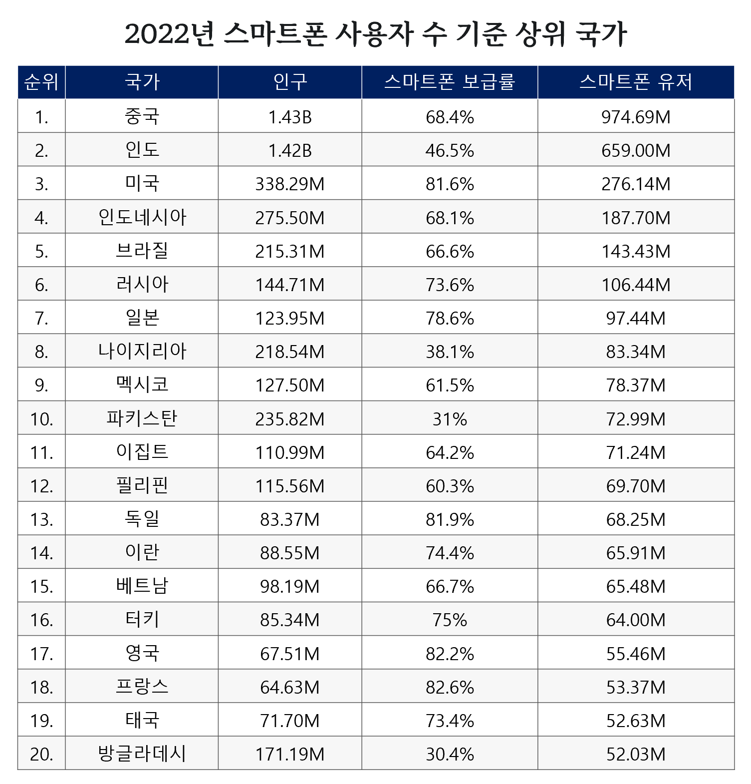 우리의 인구에 비해 상대적으로 높은 인구수를 가진 나라라고 그냥 넘기는 것은 현재의 경제전쟁의 양상을 이해하지 못하는 것이 될 것입니다. 그래서 이 데이타를 좀 더 구체적으로 이해하기 위해 스마트폰 사용자를 기준으로 활용도를 산출해 보았습니다. 네 나라가 100대의 스마트폰을 가지고 있다고 가정하고 트래픽에 따른 활용도는 미국과 일본은 100% 넘기고 있고, 중국과 인도는 각각 약 22%와 15% 였습니다. 특히 일본의 높은 활용도는 어떤 의미일까요? 콘텐츠를 생산하는 일에 앞서 있는 일본이 상대적으로 높은 활용도를 가진 다는 것은 앞으로 개인의 창작 능력과 코파일럿을 활용한 창작 능력의 싸움이 시작될 것이라는 상상을 하게 됩니다.