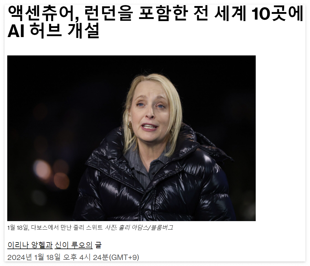 • Accenture의 인공지능 혁신: Accenture Plc는 생성적 인공지능을 위한 10개의 혁신 허브를 전 세계에 개설할 계획이며, 그 중 하나는 런던에 위치할 예정이다.