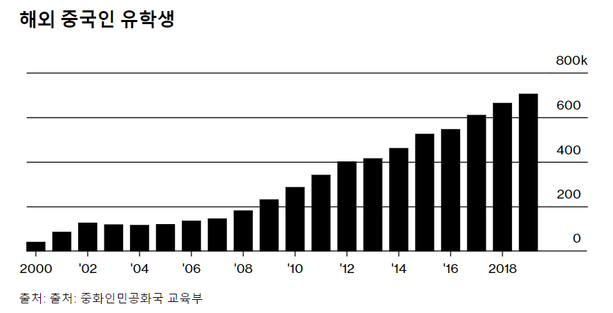 이 차트는 2000년부터 2018년까지 중국 학생들이 해외로 유학을 간 횟수를 나타냅니다. 막대 그래프 형태로, 시간이 지남에 따라 해외 유학생의 수가 지속적으로 증가하고 있음을 보여줍니다. 2000년에는 약 3만 명 정도였던 중국 유학생은 2018년에는 약 70만 명에 이르렀습니다. 이는 중국의 경제 성장과 교육 수요의 증가, 그리고 해외 대학의 유혹력 등의 요인들이 작용한 결과라고 볼 수 있습니다. 이 차트의 데이터 출처는 중화인민공화국 교육부입니다.