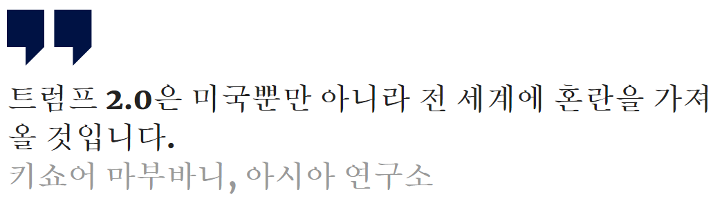 분석가들은 트럼프가 백악관에 재입성하면 오벌 오피스에서 4년 동안 겪었던 혼란과 함께 워싱턴과 나머지 세계와의 관계에 불확실성이 생길 것이라고 말했습니다. 싱가포르 아시아 연구소의 키쇼어 마부바니는 트럼프 2.0은 미국뿐만 아니라 전 세계에 혼란을 가져올 것이라고 경고했습니다.