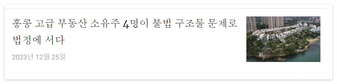 - 부자들의 불법 건축: 홍콩의 고급 주택 단지에서는 정부 승인 없이 부가적인 구조물을 만들어 집의 가치를 높이는 문제가 발생하고 있다. 이는 안전 위험과 땅 부족 문제를 악화시킨다.