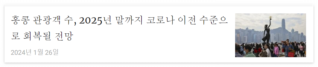 - 관광 회복 시점: 이 플랫폼에 따르면, 홍콩의 관광객 수는 2025년 말에 코로나 전 수준으로 회복될 것으로 예상되며, 2027년에는 9,400만 명에 달할 것으로 전망된다. 마카오와 다른 대만만연구구 도시들은 2024년에 회복될 것으로 예측된다.