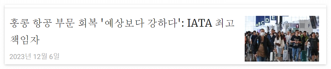 - 중국 본토의 국제 여행 수요 회복 : IATA 책임자는 중국 본토를 오가는 글로벌 여행 수요가 빠른 속도로 회복되고 있으며 내년에는 2019년 수준으로 돌아올 것으로 예상한다고 말했습니다.
